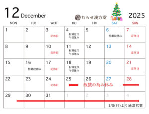 2025年も残すところあと1ケ月となりました。長い夏に短い秋。今年の冬は寒くなるそうですが、体調管理が本当に難しくなってきました。とにかく予防と、いかに免疫力を上げるか…ですね。手洗い・うがい・バンラン茶で乗り切りましょう。12月の予定ですが店内一部改装の為12/23(火)が最終営業日となります。大変ご迷惑おかけしますがよろしくお願いいたします。